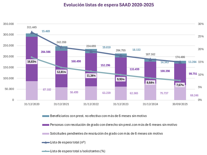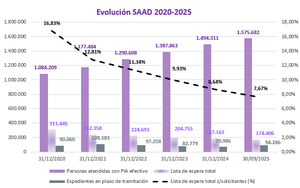 En plena presión demográfica y aumento de solicitudes para una prestación, la lista de espera sigue reduciéndose y se sitúa en 174.406 personas, lo que implica un descenso del 9,8% sobre 2024