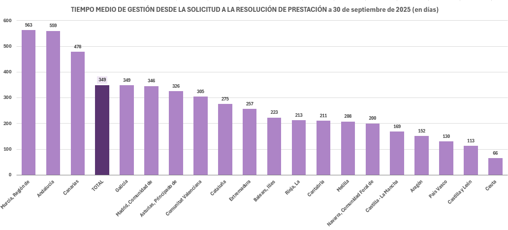 El tiempo medio de gestión se sitúa en 349 días, un dato que supone una ligera subida respecto a junio (342 días), pero mantiene una reducción de 57 días respecto al pico alcanzado en el año 2021. El tiempo medio de tramitación de las prestaciones muestra avances frente a los niveles alcanzados en los últimos años, pero continúa siendo el principal reto del Sistema. Las comunidades con mejor desempeño en este indicador son Ceuta (66 días), Castilla y León (113) y País Vasco (130), y casi todas las comunidades han logrado reducir el tiempo medio de tramitación, lo que demuestra que es posible acortar los plazos de manera significativa.