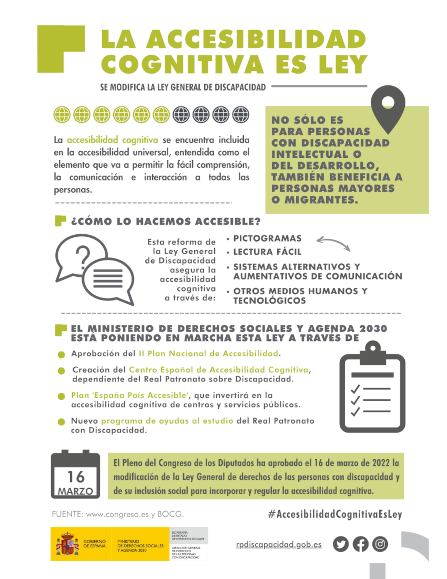 El Congreso de los Diputados aprobó el 16 de marzo de 2022 una modificación de esta Ley, impulsada por el entonces Ministerio de Derechos Sociales y Agenda 2030, para regular la accesibilidad cognitiva, dimensión de la accesibilidad universal que hasta ahora carecía de reconocimiento legal en España, como se puede ver en este diagrama: